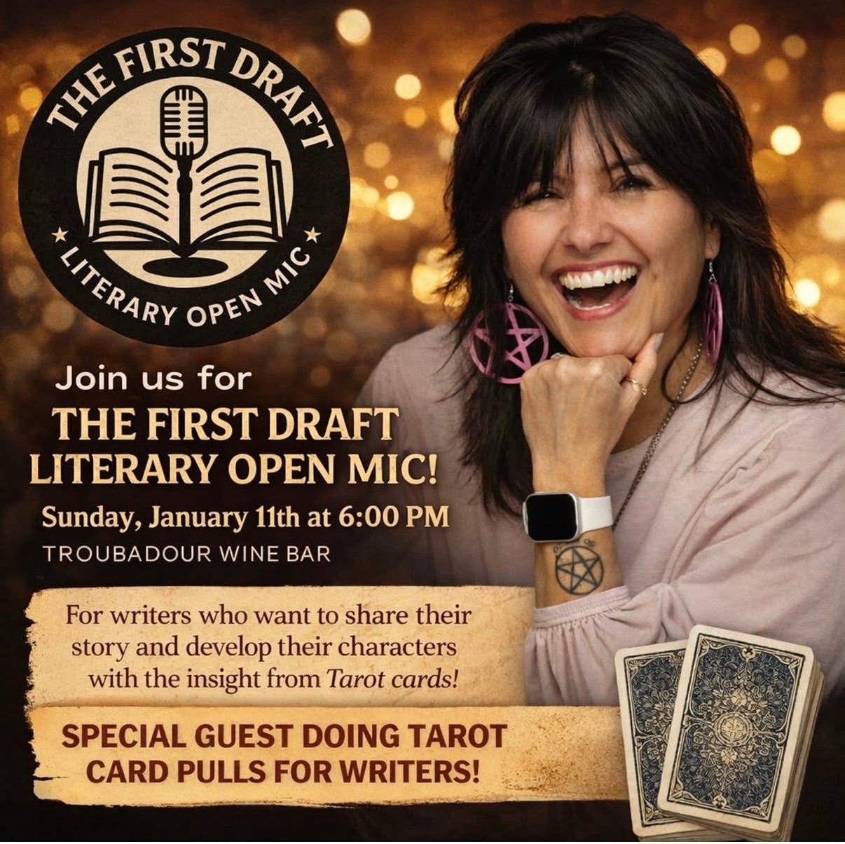I'm looking forward to attending another First Draft Minneapolis event on January 11th at the Troubadour Wine Bar. This time, however, I won’t be reading…I’ll be sharing my tarot magic with writers after the show! I will be available to both participating readers and any attendees who would like insight into their WIP. Have a question for your character? Want to know what they could be thinking, or what they could do next? Wondering where to take your plot? Wanting to do more journaling, but you’d like a prompt from the tarot to start? The next topic for your newsletter??